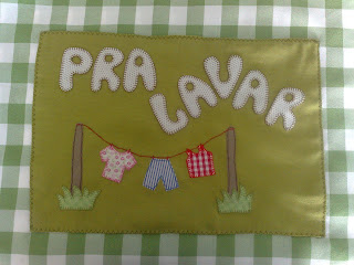 Saco para roupa suja, forrado com tecido impermeável e cordões para fechar.